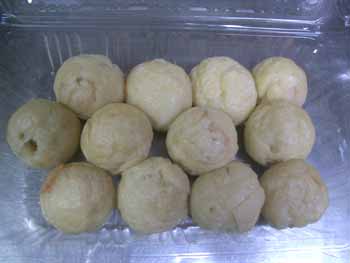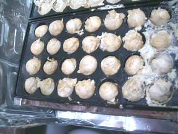 | 昨日の失敗をモトに、 今回は最初から、市販の「たこ焼き用の粉」を使用。 分量は同じ。 まずは「丸める練習」に専念することに、、、 |