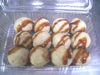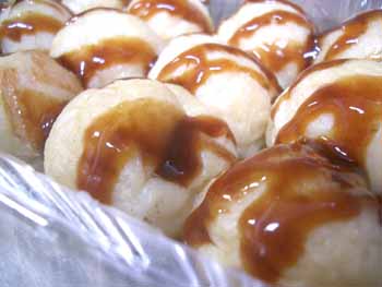 | 一応、パックに入れてみました。 (パックは、100円SHOPで16パック入) 試作段階なので、たこ焼きと市販ソース(イカリたこ焼きソース)のみ |