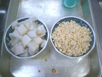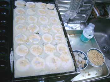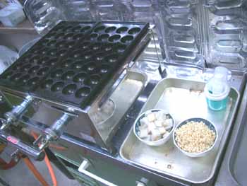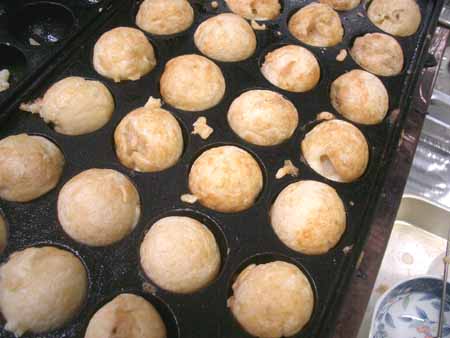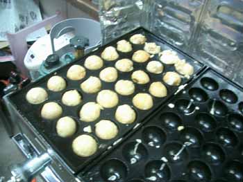 | 「市販のたこ焼き粉」を使わず、 「普通の小麦粉(薄力粉)」で、どうにか丸まるようになりましたので、 今回から具材を入れてみました。 具材は「丸天」と「天カス」のみ! |