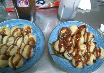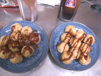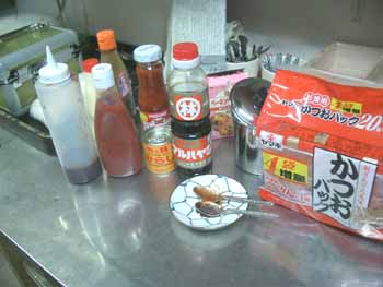 | 今回は、ソース作りに挑戦! 基本として、ウスターソースとケチャップを半々に混ぜてみました。 市販のたこ焼きソースと味比べをしましたが、 「甘み」が、まったく無い! トマトの酸味が強すぎてダメ〜 チリソース、からし、マヨネーズ、等など いろいろ試しましたが大失敗! うぅ〜ん、難しい!(←あたりまえ!(^^ゞ) |