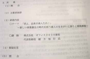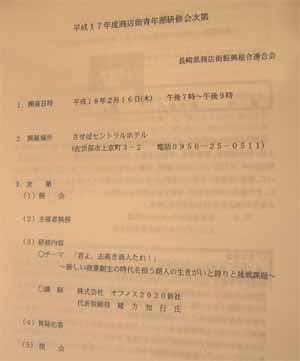| 長崎県商店街振興組合連合会 (事務局:長崎県中小企業団体中央会) 「平成17年度商店街青年部研修会」 佐世保会場 日時:平成18年2月16日(木)午後7時〜9時 場所:させぼセントラルホテル 研修内容 テーマ:「君よ、志高き商人たれ!」 〜新しい商業創生の時代を担う商人の生きがいと誇りと挑戦課題〜 講師:(株)オフィス2020 代表 緒方知行 氏 http://www.office2020.co.jp/ 参加費:無料 |