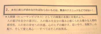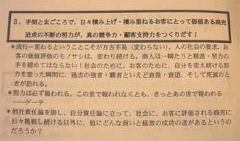 | ・拡大拡散の時代→凝縮の時代へ ・文化、地域性、環境の時代 貧しさの中で考える「豊かさ」=物財(経済) ↓↓↓ 貧しくない中で考える「豊かさ」=文化(心) 10人一色 → 10人十色 → 1人十色(多様多彩) 10人一色=コモディティ ex,マクドナルド 販売促進 → 購買促進 「スケールメリット」は製造の論理であって、商業の論理ではない! 経済の論理=「哲学」 「量」は「質」を越えられない! 「効率」→「効果」へ! 規模の大小ではない! ユニバーサルデザインに対応できるかどうか? (ハンディキャップの方でも楽しめるか?) ハードウェア ↓ ソフトウェア (知恵・情報) ↓ ヒューマンウェア (人間力) 中心市街地(まち)の重要性 まちであるためには?→「情報の発信」! 何がしたいか?→こういうのはどうでしょうか?(提案型) 同質競争の終焉→多様性に対応する商業の進化 人まねしない、オリジナリティ、オンリーワン 「志」 |
