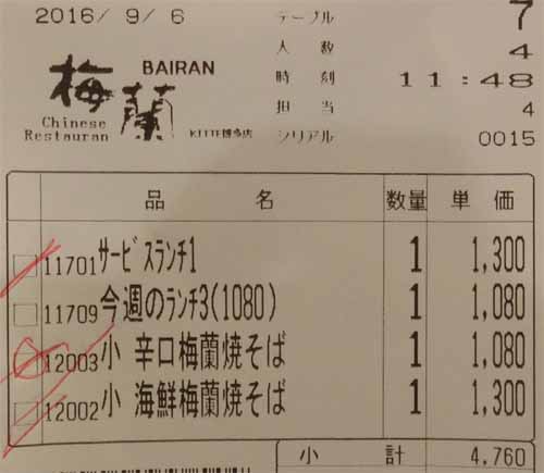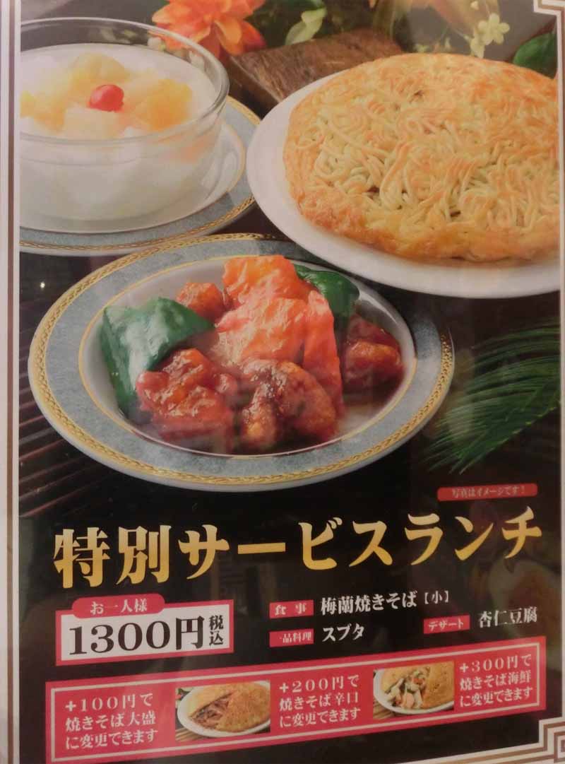 サービスランチ:梅蘭焼きそば(小)+スブタ+杏仁豆腐:1300円