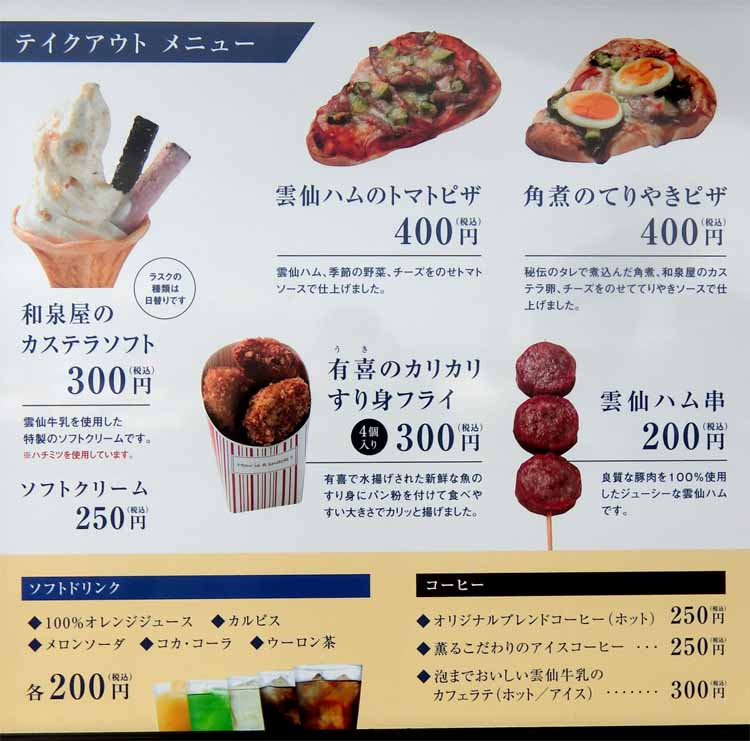 | 長崎県雲仙市愛野町乙5864 電話0957-36-2000 レストラン 11:00〜15:00 売店 8:30〜17:30 テイクアウト 9:00〜16:30 年中無休 http://www.n-izumiya.com/shop/castella-land.html |