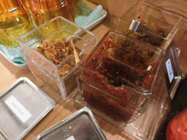 ![]() 自家製ラー油、辛子高菜、にんにくチップ、紅ショウガ |
