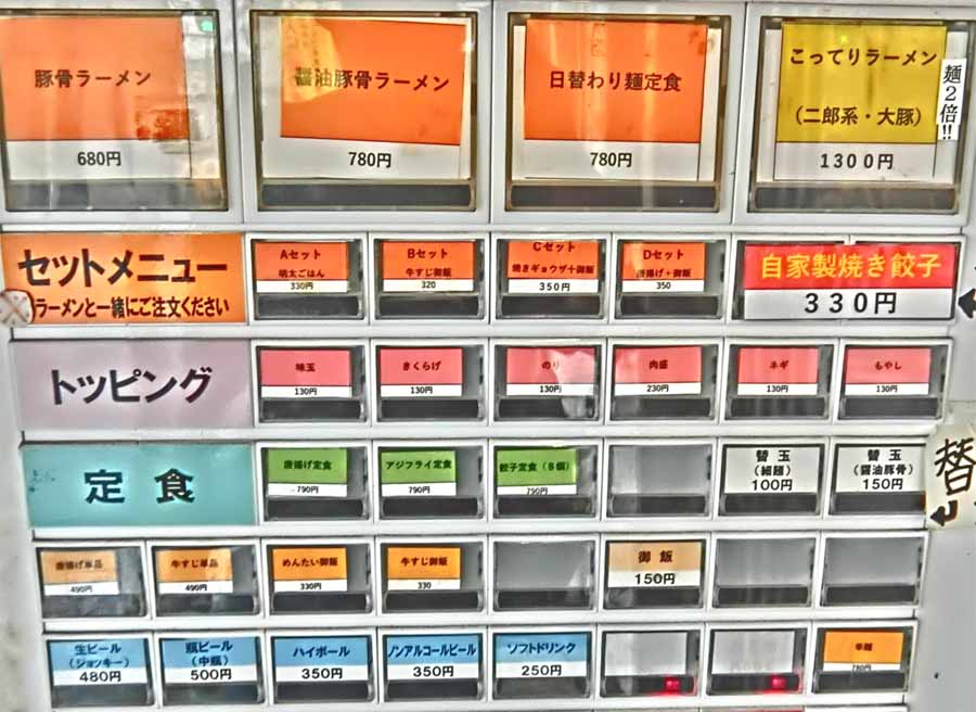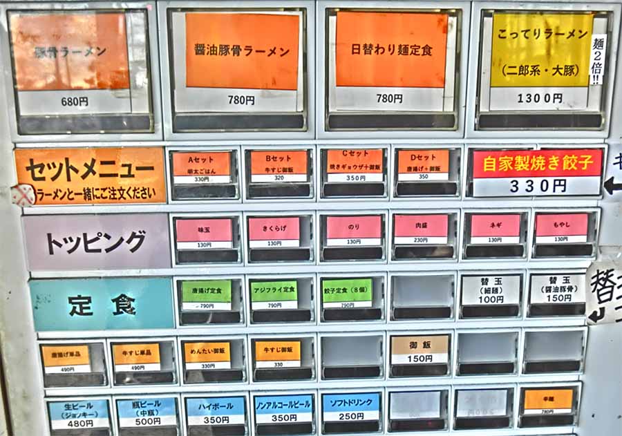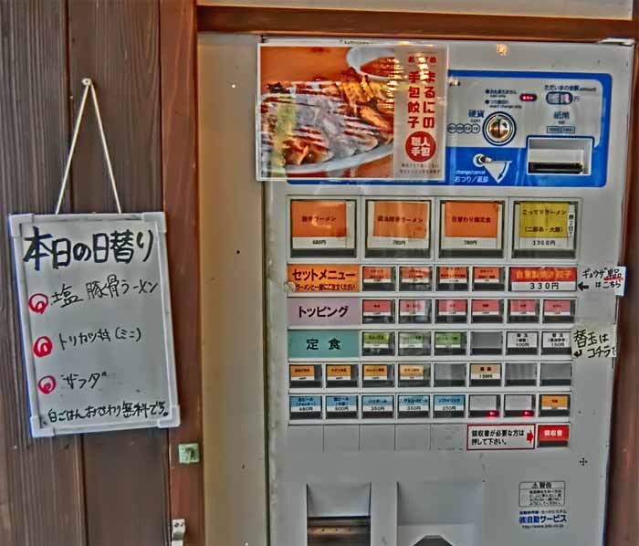 | お昼は「券売機」システム ラーメンセット、唐揚げ定食、アジフライ定食、餃子定食、各種トッピング ![]() |