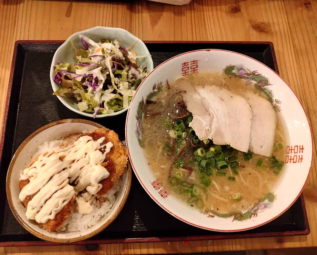 | 日替わり麺定食:780円 *ごはんおかわり無料 塩豚骨ラーメン +ミニ鶏かつ丼 + ミニサラダ |