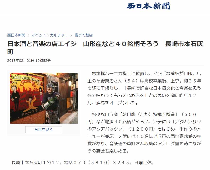 | KBC九州朝日放送「Duomoドォーモ」 「九州路地裏酒場」思案橋近くの渋い通りの渋い酒場 「日本酒と音楽の店 エイジ」 ![]() http://diary.mizuyashiki.com/2018/08/0813duomo/ |