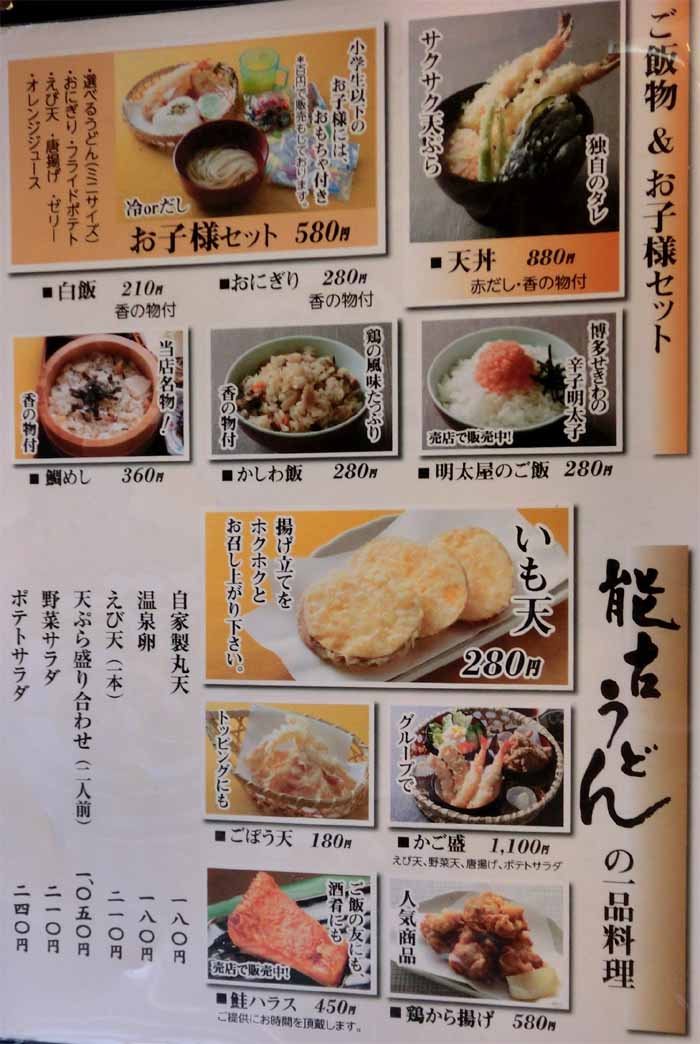 | パリパリ!ゴボウ天!細くてツルツルうどん! 福岡の有名うどん古式切り麦「能古うどん」の長尾本店。 博多駅から南西の方向に車で15分ほどの県道555号(山荘通り)沿い。 駐車場は、店横にP5台ほど+スグ横P30台で、十分な広さ。 上品な和風の落ち着いた雰囲気で、手前に売店、奥に食事処。 カウンター6席、4人テーブル×6席、8人テーブル×1席、小上がり6人座敷×2席。 ◎ごぼう天うどん(だし汁) ◎鯛めしセット (だし汁) ◎冷やしテンプラうどん(ぶっかけ)◎おにぎりセット(ぶっかけ) ◎トッピング:ごぼう天 等をいただきました。 うどんは、細麺で、ツルツルとノドごしも良く、 適度なコシもあって、たいへん美味しかったです。 だし汁も上品なカツオだしで、私好みの味。^^ うどんは、3種類(だし/つけめん熱/つけめん冷)から選べます。 天ぷらも揚げたてアツアツでしたし、ゴボウ天が幅広薄切りのパリパリでマヂ美味でした。 売店もあったので、帰りに「能古うどん」を土産に買って帰りました。 |
