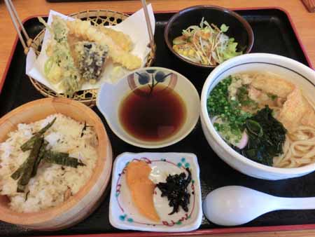 | 雅セット:1380円 ごぼう天うどん、テンプラ盛合せ、鯛めし、野菜サラダ、香の物 |