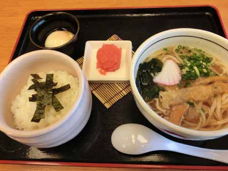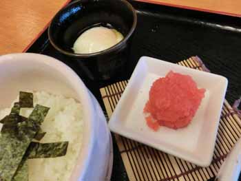| 明太卵かけご飯セット:780円 ごぼう天うどん、辛子明太子、温泉卵、白ご飯 |