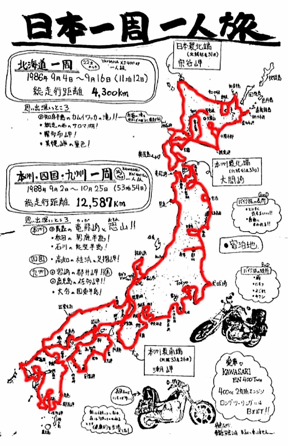 | 大阪からふるさとへ このバイク(KAWASAKI EN400)で帰ってきました。 1988年9月2日〜10月25日 日本一周の旅 ![]() 走行距離 12.587km 1991年〜 普賢岳噴火災害での降灰の為、 バイクに乗れる状態ではなく、倉庫に寝せたままでした |